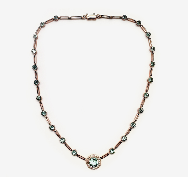 Um 1920, 585 Gelbgold und Platin, ca. 1,8 ct Diamanten im 8-Kant-Schliff, 22 Aquamarine in Zargenfassung und zentraler Aquamarin Dm. 9 mm, Länge: 43 cm.