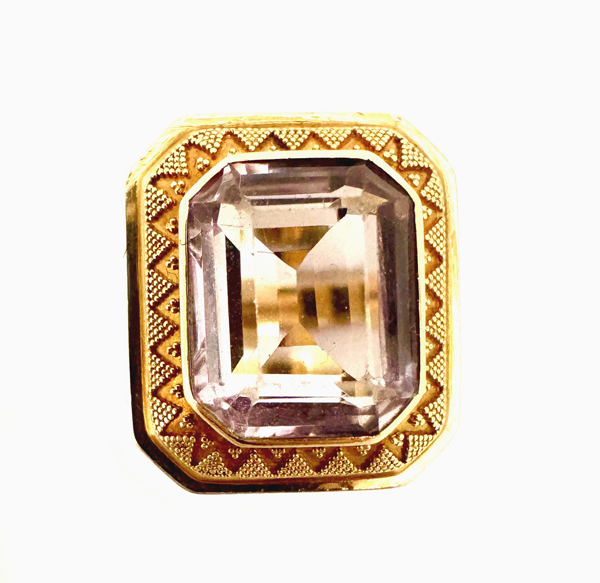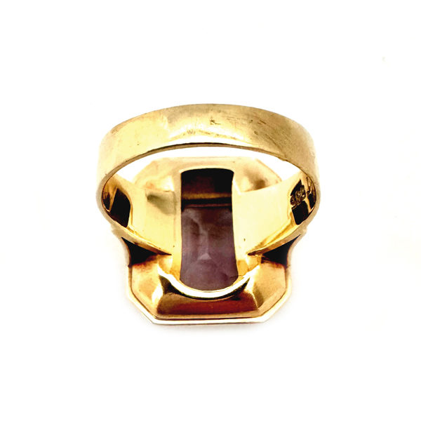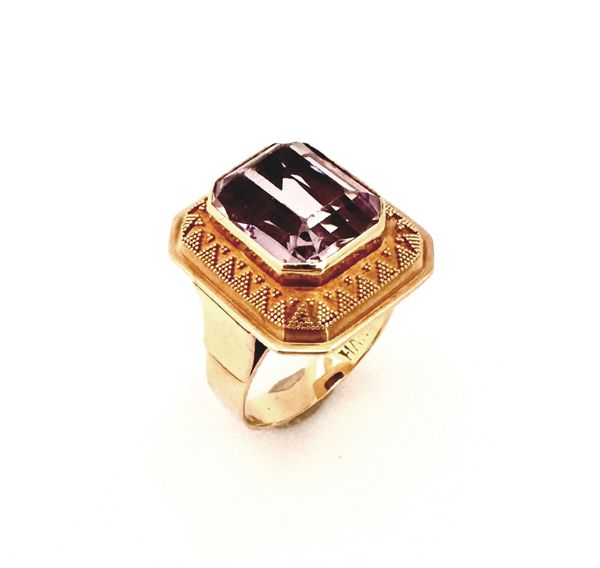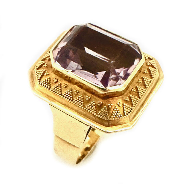 Vintage, 585er Gelbgold, feine Handarbeit mit Granulationstechnik, heller Amethyst im Tafelschliff (12 x 10 mm), RW:56.