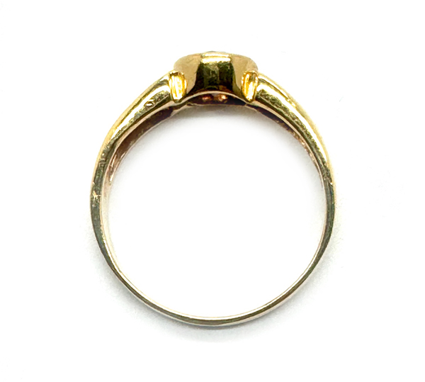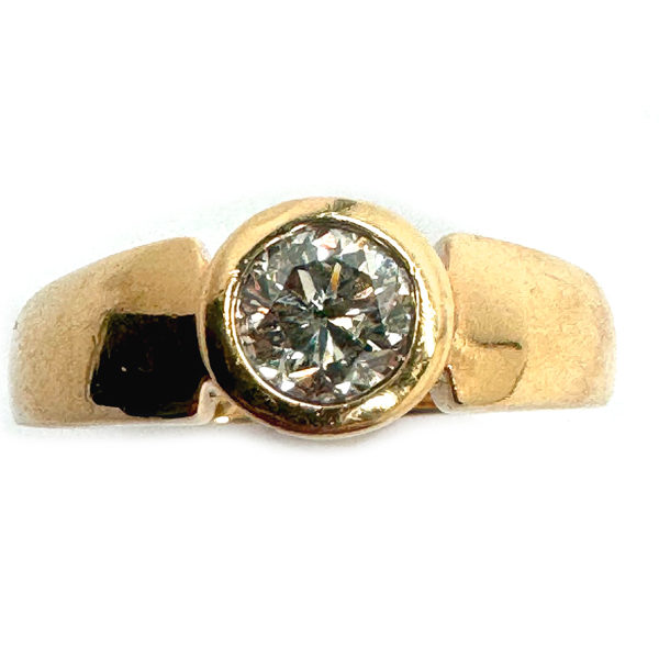 Vintage, 750er Gelbgold, zentral ein Diamantsolitär im Brillantschliff von ca. 0,9 ct (P1) im mittleren Farbgrad in Zargenfassung, RW 66.