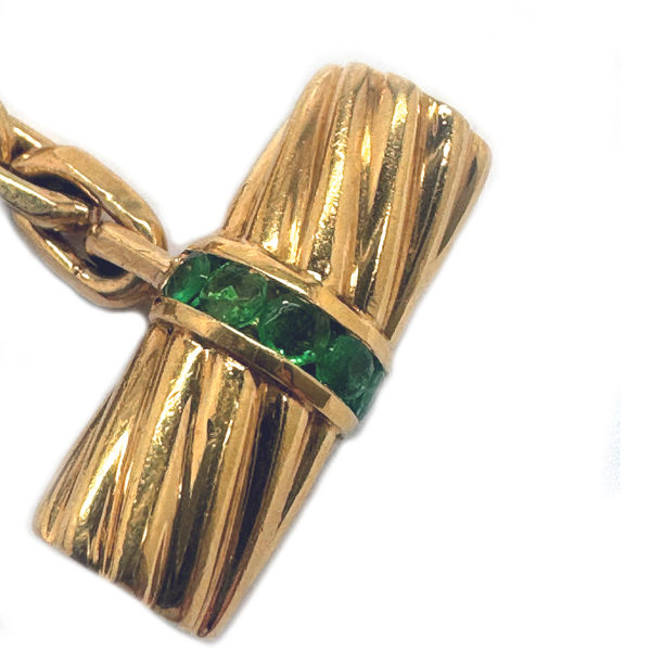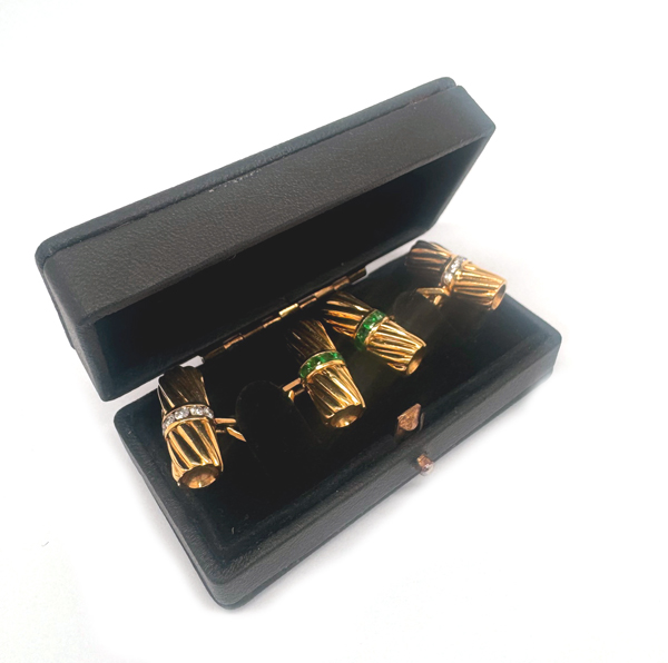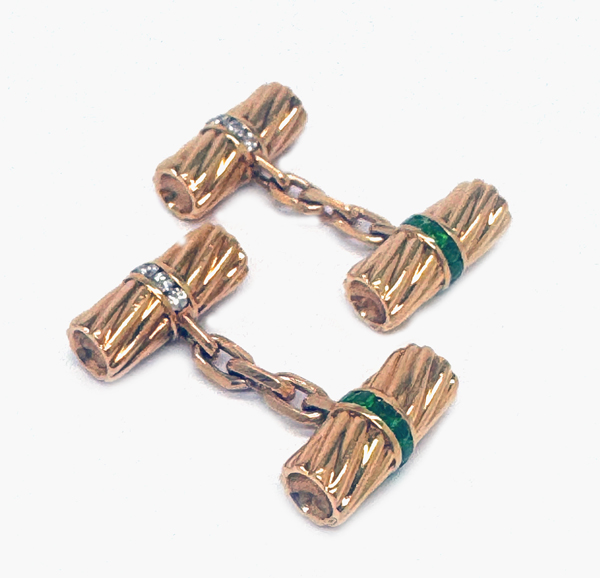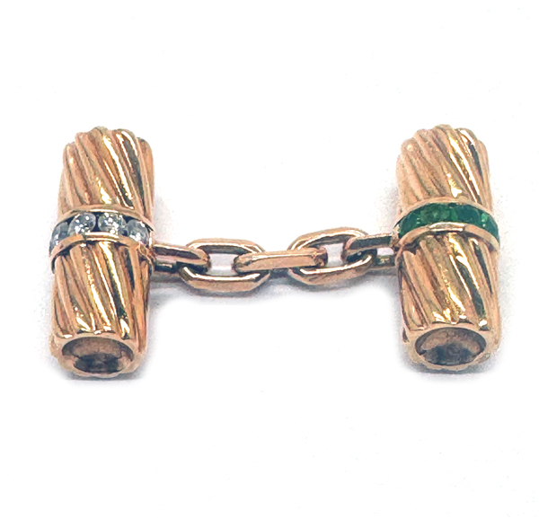 Vintage, 750er Gelbgold, klassische Manschettenknöpfe in Knebelform, besetzt mit Smaragden und Diamanten, Breite: 1,6 cm.