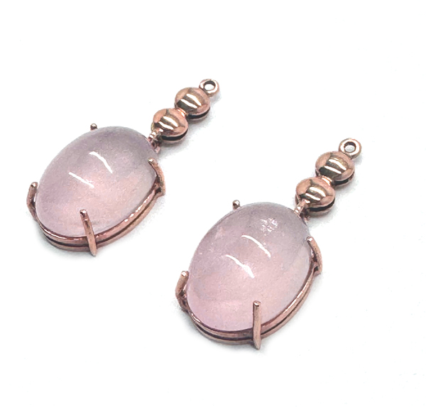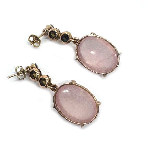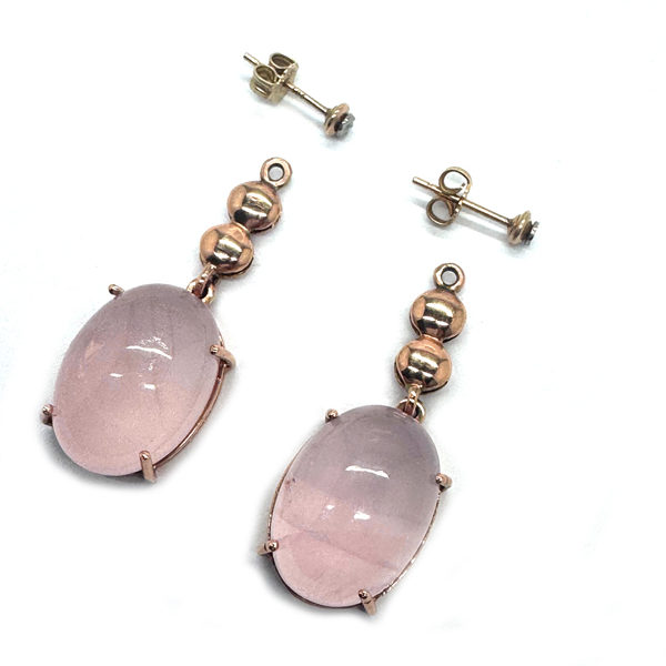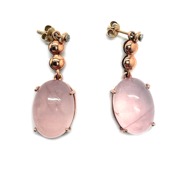 Vintage, kleine Diamantstecker, 585 Roségold, zum Einhängen: ovale Rosenquarz-Cabochons (18 x 14 mm), Gesamtlänge: 3,4 cm.