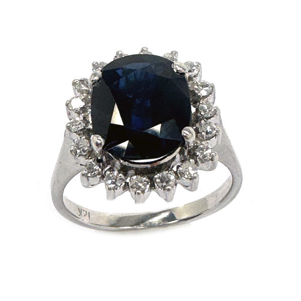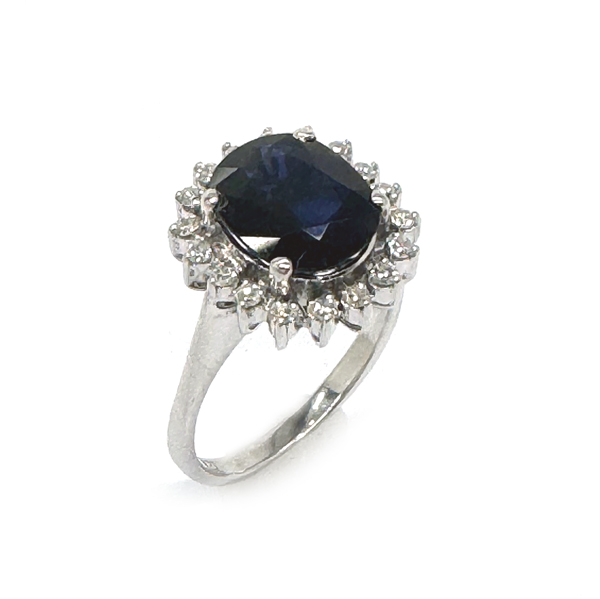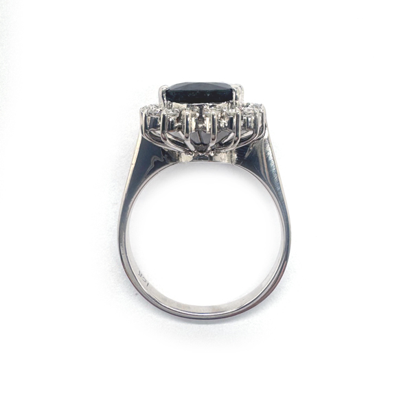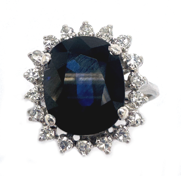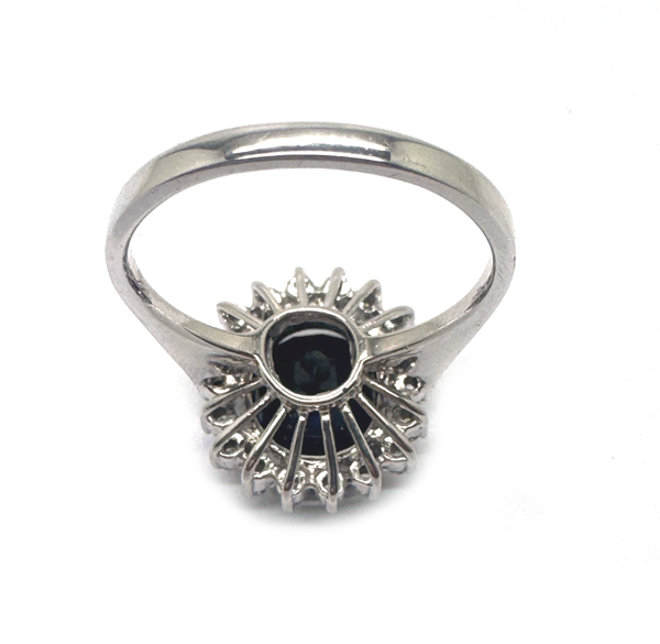 1960er Jahre, 750er Weißgold, oval facettierter dunkelblauer Saphir (9 x 12 mm), gerahmt von 18 Diamanten im 8/8-Schliff, RW: 56.