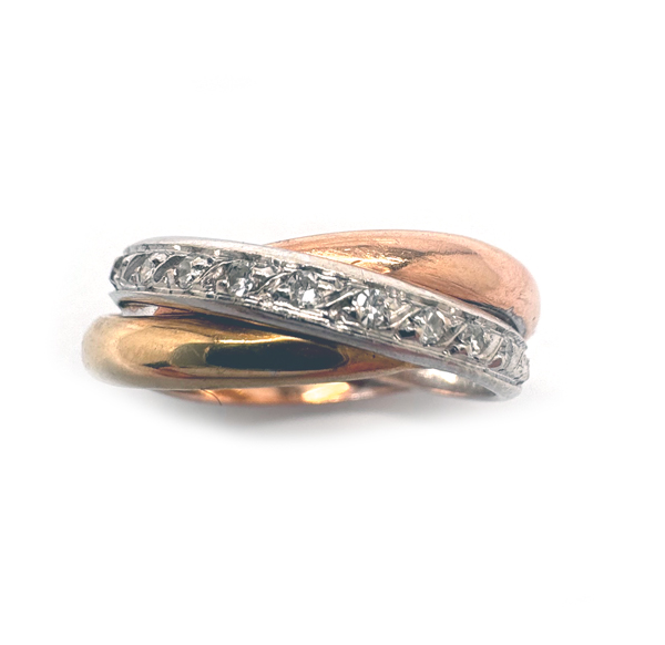 Vintage, 585 Gelb-, Weiß- und Roségold, die Weißgoldschiene ist mit kleinen Diamanten besetzt, RW 48.