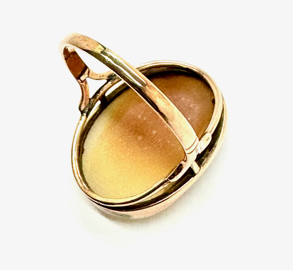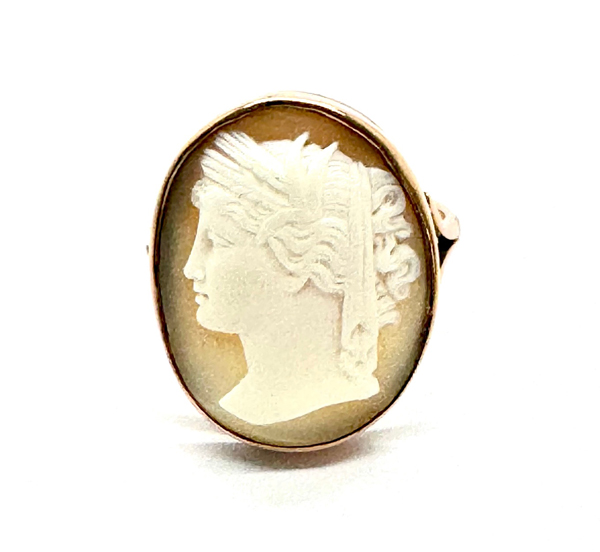 Euro 980,-Differenzbesteuerung nach §25a UStG.Ende 19. Jahrhundert, Ringschiene in 9 K Rotgold, darin ovale Muschel-Kamee mit antikischem Frauenportrait im Profil, RW 56.