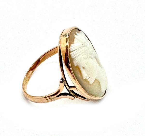 Ende 19. Jahrhundert, Ringschiene in 9 K Rotgold, darin ovale Muschel-Kamee mit antikischem Frauenportrait im Profil, RW 56.