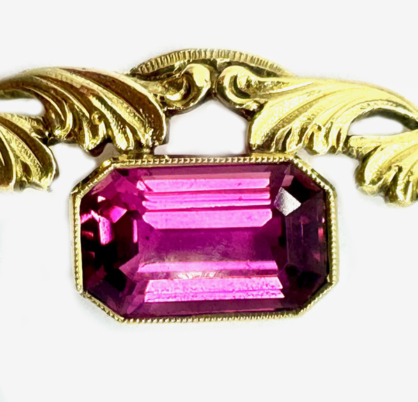 Vintage, 750er Gelbgold, (Meisterzeichen CH), Amethyst-Kugeln, pinke Rubine im Carrée und ein Brillant im hohen Farb- und Reinheitsgrad von je ca. 0,2 ct, Durchmesser: 1,9 cm.